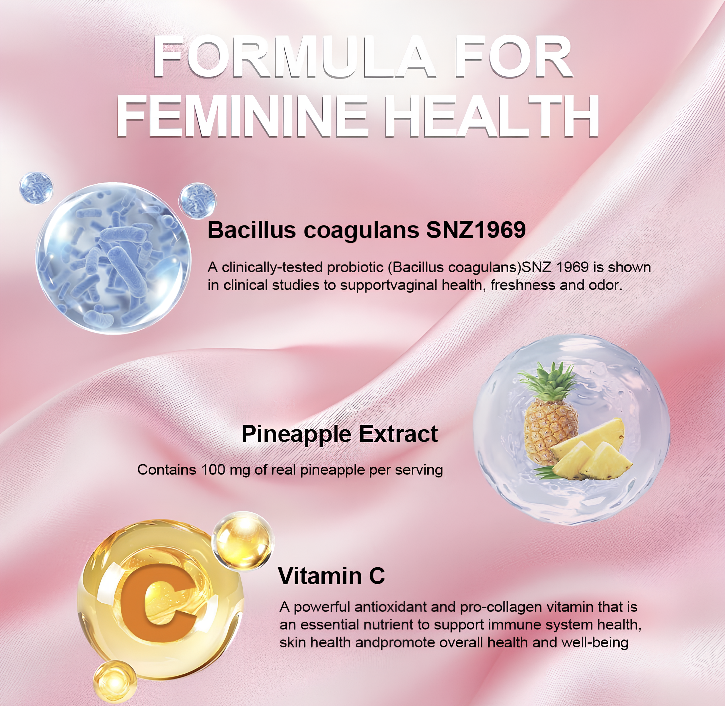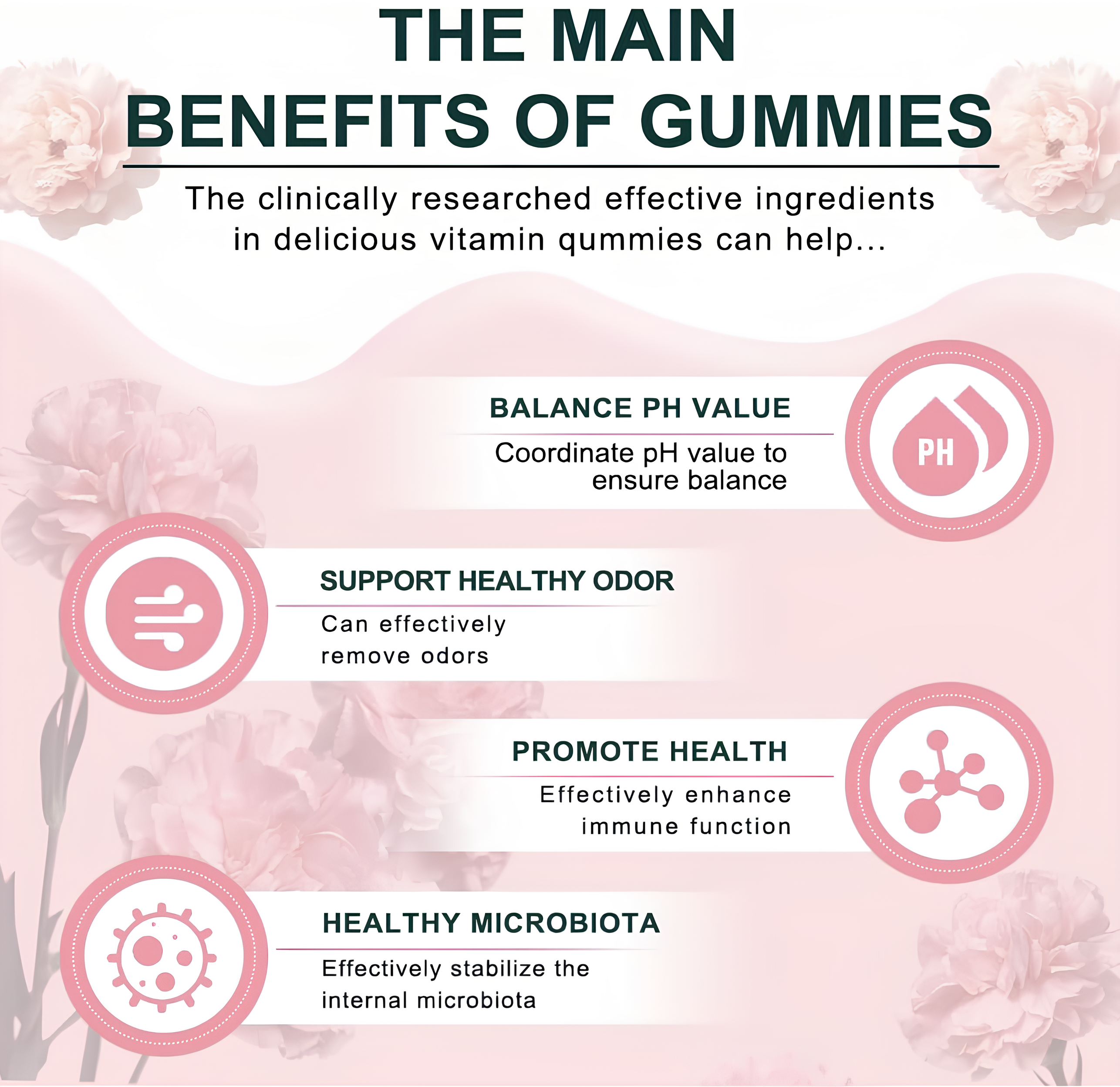 Our gummies work by providing your body with natural ingredients that help support hormone balance. They contain key nutrients that help regulate your hormones, improve mood, and reduce discomfort associated with hormonal fluctuations, promoting overall feminine health. Just take one gummy a day to help keep things in balance.