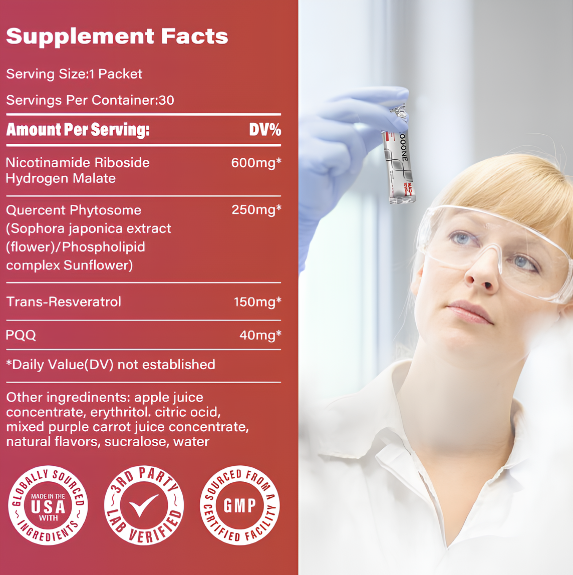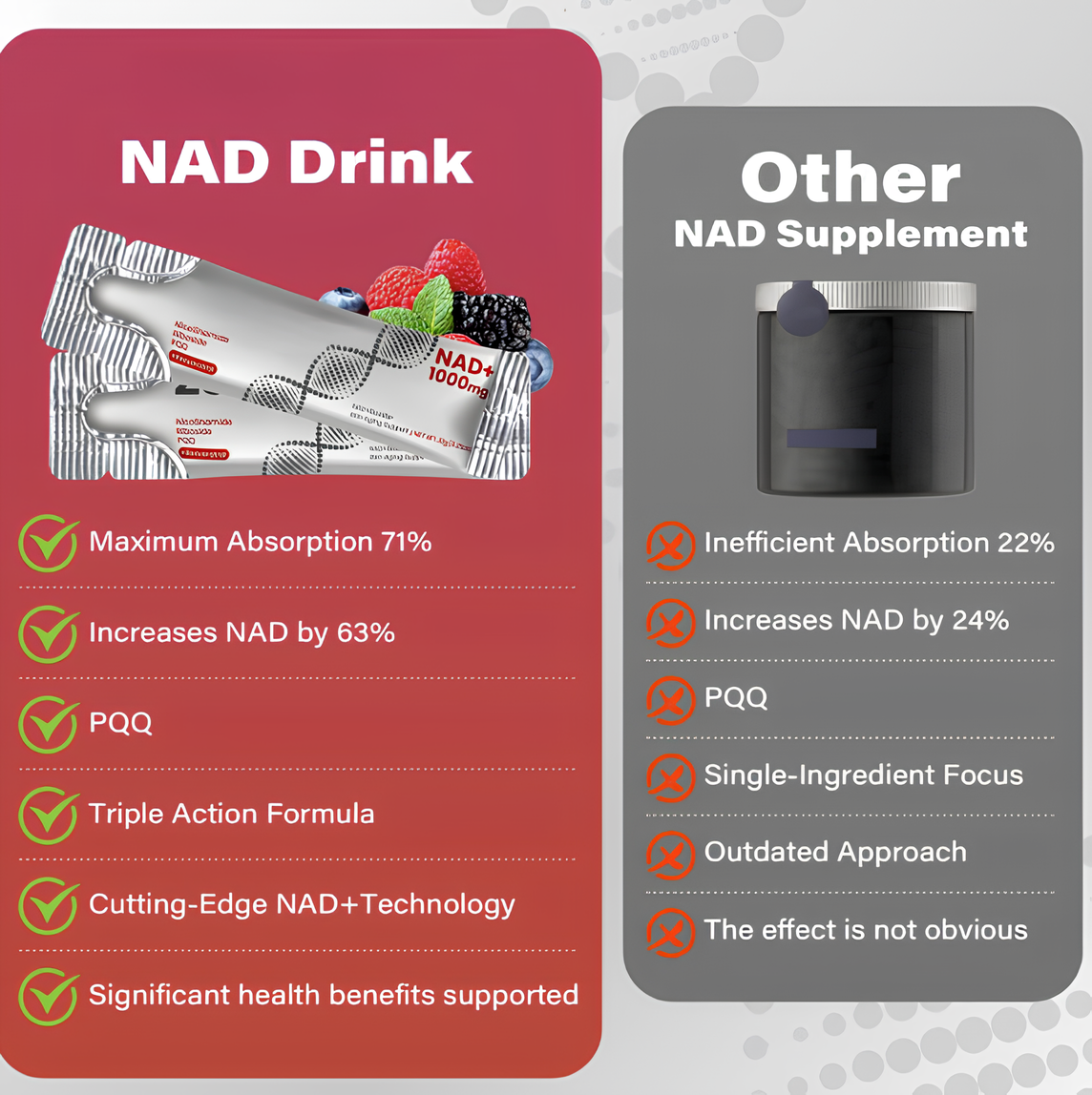 Our formula is a berry-flavored drink mix designed to support skin health, energy, and focus. Each serving delivers nicotinamide riboside (NR), a form of vitamin B3 that boosts NAD+ levels—a molecule essential for cellular energy and repair. By enhancing NAD+ production, it helps improve skin elasticity, reduce signs of aging, and promote mental clarity. Simply mix with water and enjoy a convenient way to rejuvenate your body from within. With over 28,000 satisfied customers, it's a trusted choice for those seeking to revitalize