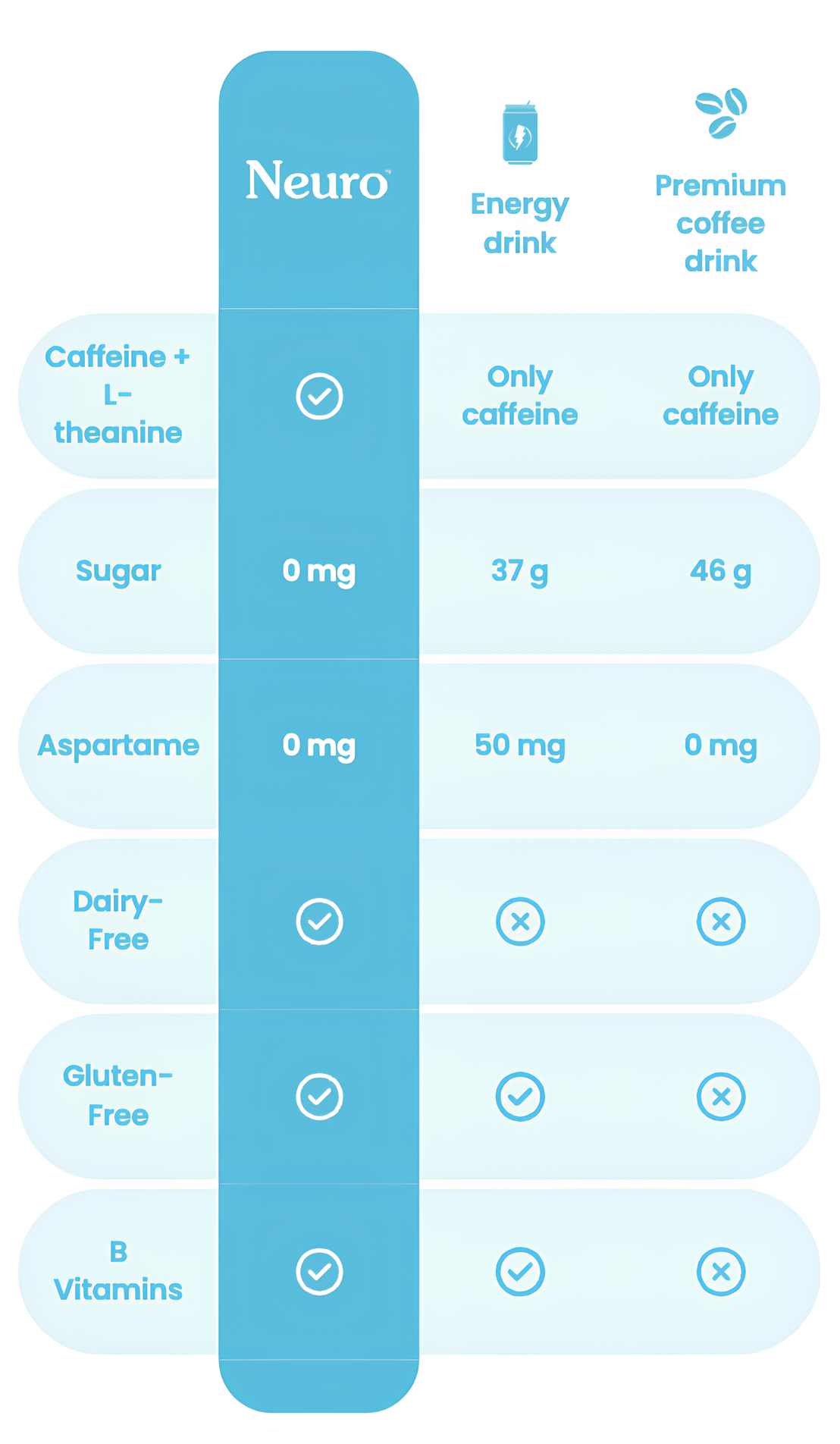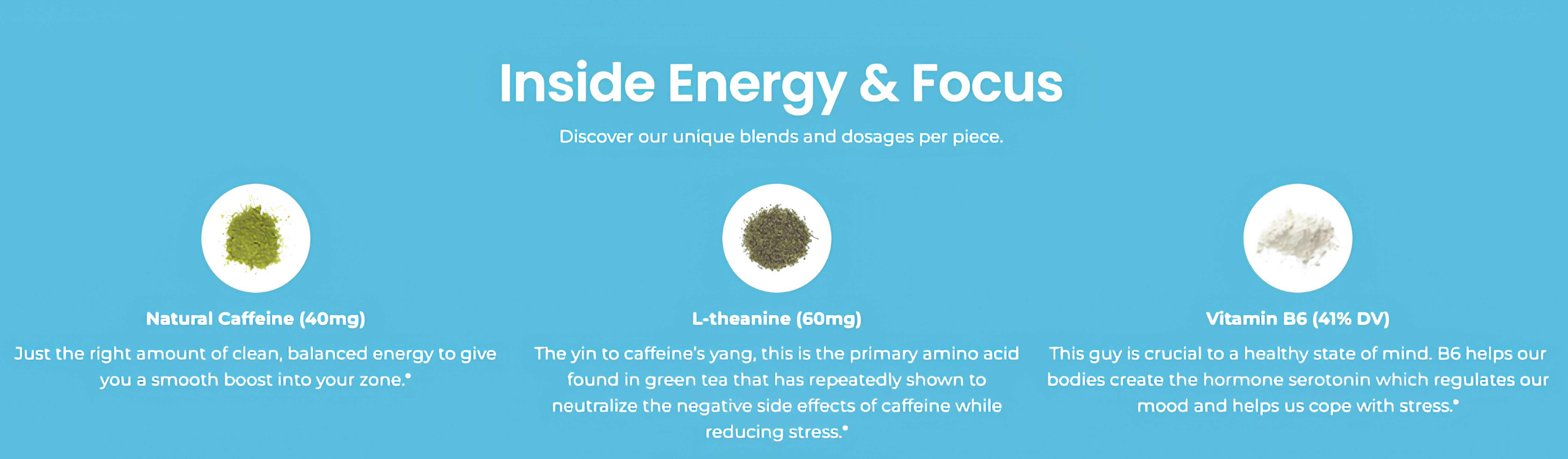 Our formula is a functional chewing gum that gives you a clean, balanced energy boost. Each piece contains natural caffeine, L-theanine, and B-vitamins to enhance focus and alertness without the crash. The ingredients are absorbed quickly through your mouth for faster results than coffee or energy drinks. You get about 40mg of caffeine per piece—roughly half a cup of coffee. It’s sugar-free, portable, and easy to use anytime you need a mental boost. Just chew and go.