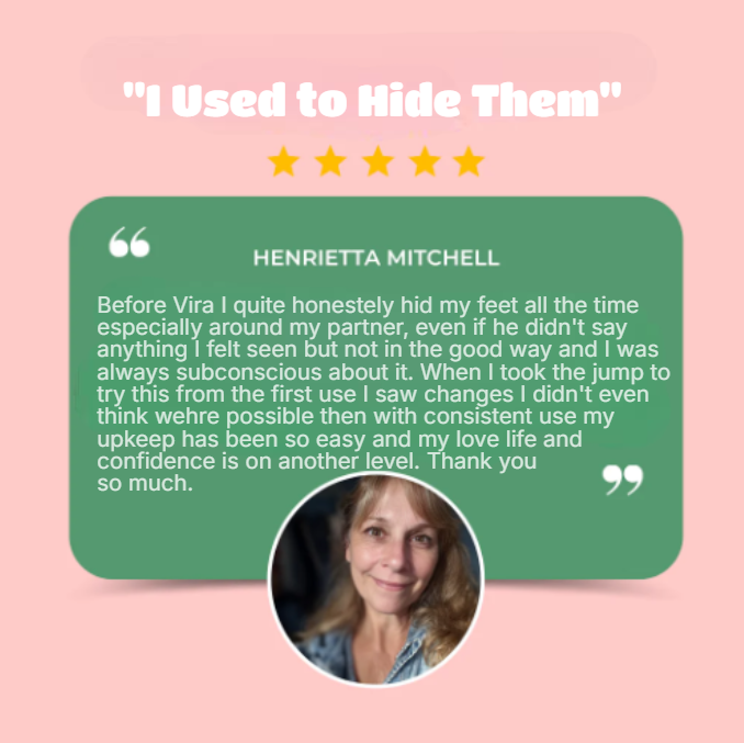 My biggest fear has always been infection. One crack can lead to something serious. Since using VIRA FEET, my skin feels stronger, smoother, and actually protected. I sleep better at night knowing my heels aren’t getting worse. My biggest fear has always been infection. One crack can lead to something serious. Since using VIRA FEET, my skin... My biggest fear has always been infection. One crack can lead to something serious. Since using VIRA FEET, my skin feels stronger, smoother, and actually protected. I sleep better at night knowing my heels aren’t getting worse.